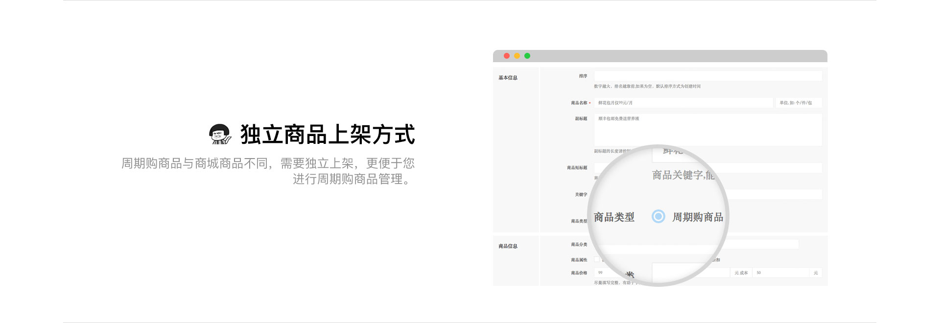 买家一次性付款,商家可按周期向买家发货,满足您周期性业务需求,让您一次锁定客户,快速回笼资金。 周期购商品特色 支持独立商品上架方式;支持多规格添加;支持修改预计送达时间;支持快递和同城配送;支持修改收货日期、顺延发货、修改商品收货地址。